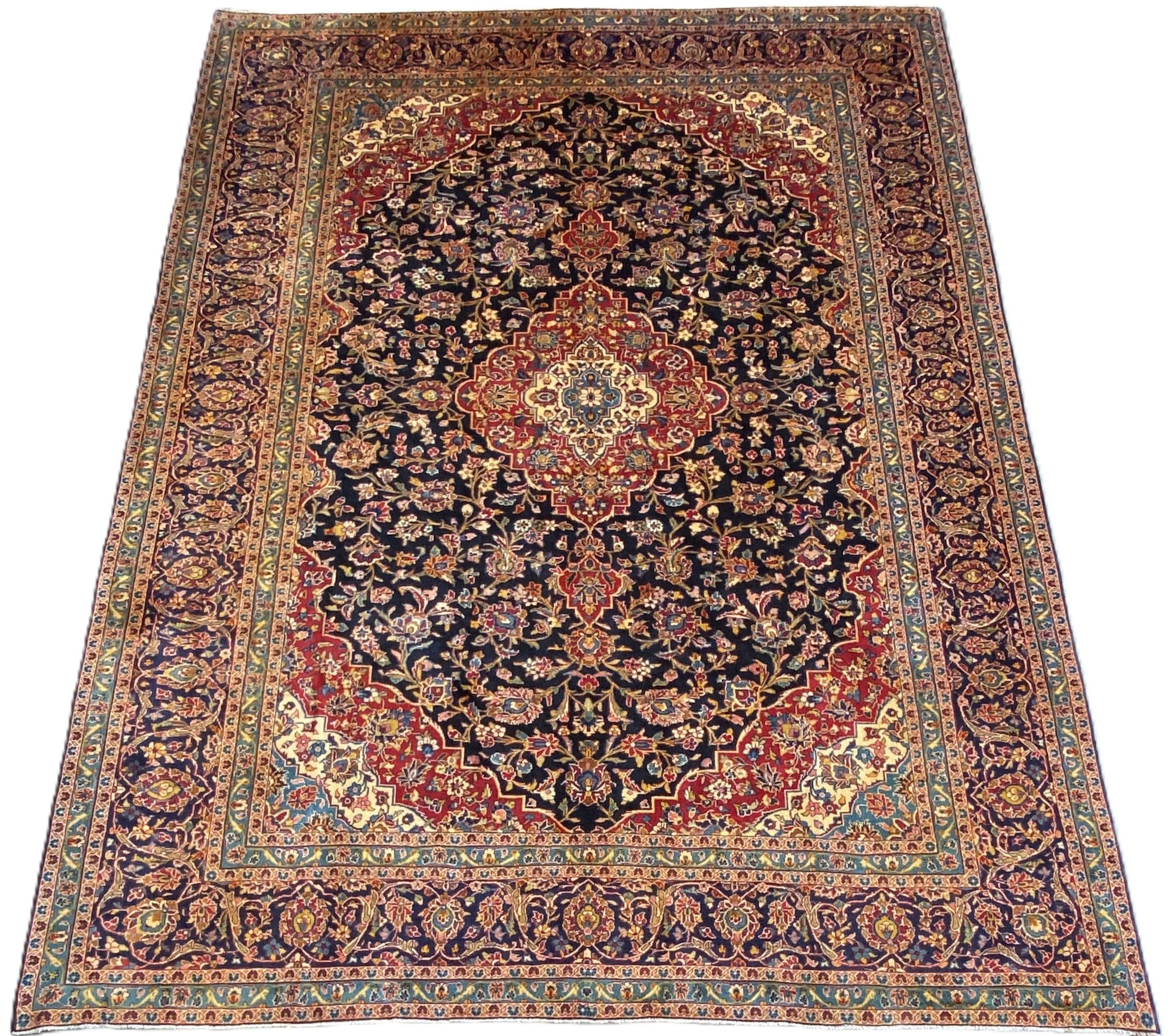 Kashan rugs are hand-knotted in the ancient city of Kashan, Isfahan province, known for their high quality, often featuring an intricate central medallion, detailed floral designs, and a Shah Abbas pattern field with flowing vines. These rugs typically use fine wool or silk with designs ranging from traditional medallion styles to open-field patterns, and are recognized as benchmark pieces in Persian rug production.